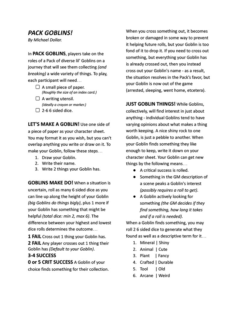 PACK GOBLINS is a TTRPG where players take on the role of a Pack (or Backpack) of diverse lil’ Goblins on a journey that will see them collecting (and occasionally breaking) a wide variety of things.